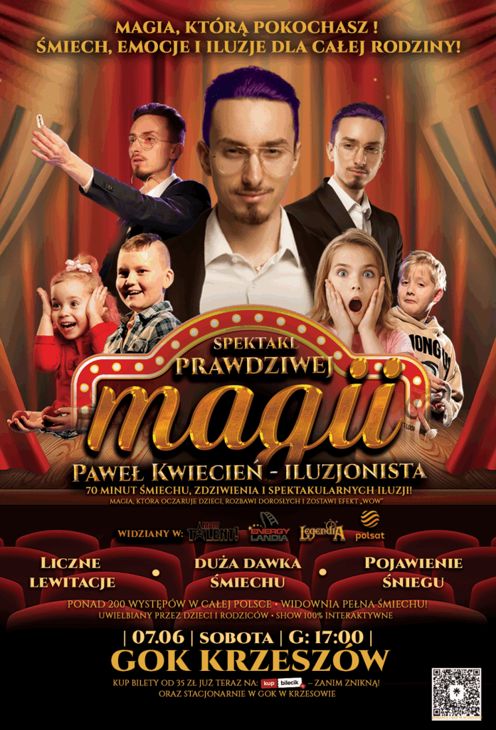 Aktualności Komunikaty Kultura i rozrywka Wydarzenia Najbardziej magiczny spektakl rodzinny w Polsce już 7 czerwca w Krzeszowie! Przez Redakcja Wysłany dnia 28 maja 2025 1 min read 0 0 1,006 Podziel się Facebook Podziel się Twitter 🔮 Najbardziej magiczny spektakl rodzinny w Polsce już 7 czerwca w Krzeszowie! Wydarzenie z okazji Dnia Dziecka 🎉 ✨ Odkryj iluzję, która bawi, wzrusza i zaskakuje! To 70 minut pełnych czystej magii, śmiechu i rodzinnych emocji – w wykonaniu jednego z najbardziej utalentowanych iluzjonistów młodego pokolenia. 🎩 Na scenie pojawi się: ✨ Paweł Kwiecień – Iluzjonista ✨ Lewitacje i zniknięcia ✨ Udział widzów na żywo ✨ Hipnotyzująca muzyka i światła ✨ Efekty specjalne, które zapamiętacie na długo 📅 Kiedy? 07 czerwca 2025 | godz. 17:00 📍 Gdzie? GOK Krzeszów 🎟 Bilety już od 35 zł! Do kupienia online: 👉 www.iluzjonistapawelkwiecien.com/krzeszow …oraz stacjonarnie w Ośrodku Kultury. Pełne sale w całej Polsce mówią same za siebie 🔥 Przeżyj magię razem z nami – dla dzieci, dorosłych i wszystkich, którzy lubią się dziwić! ⬇️ KUP BILET DLA SIEBIE LUB PODARUJ GO KOMUŚ, KOGO KOCHASZ ⬇️ www.iluzjonistapawelkwiecien.com/krzeszow