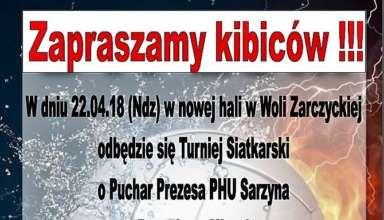 Aktualności Turniej Siatkarski w Woli Zarczyckiej W dniu 22.04.2018 (niedziela) w nowej hali w Woli Zarczyckiej odbędzie się Turniej Siatkarski o Puchar Prezesa PHU Sarzyna – Bogusława Miazgi. Rywalizować będą następujące zespoły: 1. PHU Sarzyn… Czytaj więcej