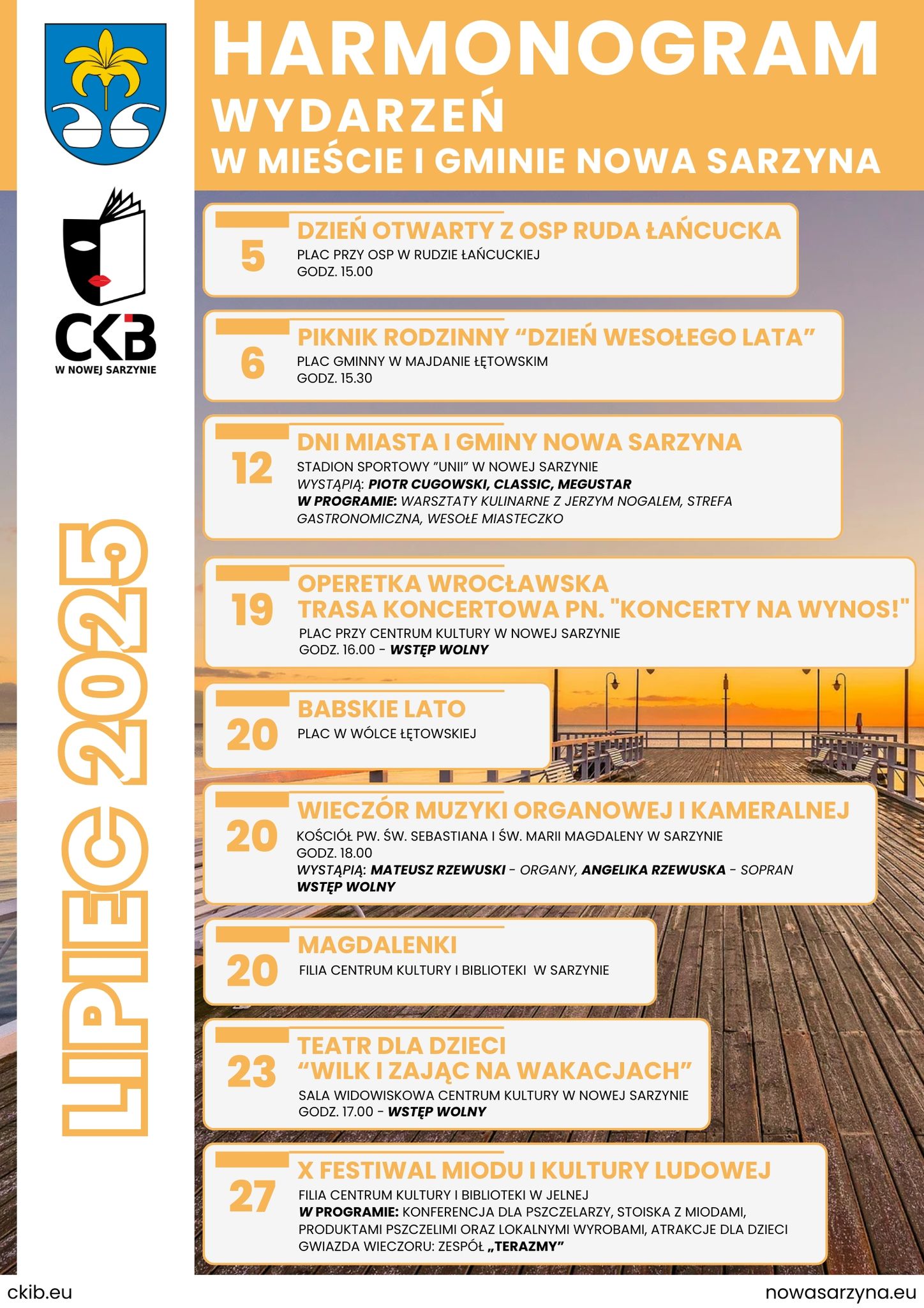 Aktualności Komunikaty Kultura i rozrywka Lipiec pełen wydarzeń! Przez Redakcja Wysłany dnia 1 lipca 2025 2 min read 0 0 924 Podziel się Facebook Podziel się Twitter Sprawdź, co będzie się działo w Mieście i Gminie Nowa Sarzyna! 5 lipca – Plac przy OSP w Rudzie Łańcuckiej godz. 15:00 – Dzień otwarty z OSP Ruda Łańcucka 6 lipca – Plac gminny w Majdanie Łętowskim godz. 15:30 – Piknik rodzinny „Dzień Wesołego Lata” 12 lipca – Stadion sportowy „UNII” w Nowej Sarzynie Dni Miasta i Gminy Nowa Sarzyna Wystąpią: Piotr Cugowski, Classic, MeGustar warsztaty kulinarne z Jerzym Nogalem, strefa gastronomiczna i wesołe miasteczko! 19 lipca – Plac przy Centrum Kultury w Nowej Sarzynie godz. 16:00 – Operetka Wrocławska – „Koncerty na WYNOS!” (wstęp wolny) 20 lipca Plac w Wólce Łętowskiej – Babskie Lato 20 lipca Kościół w Sarzynie – godz. 18:00 – Wieczór Muzyki Organowej i Kameralnej Mateusz Rzewuski – organy, Angelika Rzewuska – sopran (wstęp wolny) 20 lipca Filia CKiB w Sarzynie – Magdalenki 23 lipca – Sala widowiskowa CKiB w Nowej Sarzynie godz. 17:00 – Teatr dla dzieci „Wilk i Zając na wakacjach” (wstęp wolny) 27 lipca – Filia CKiB w Jelnej X Festiwal Miodu i Kultury Ludowej W programie: konferencja dla pszczelarzy, stoiska z miodami i lokalnymi produktami, atrakcje dla dzieci Gwiazda wieczoru: Zespół „TerazMy” Zabierz rodzinę, sąsiadów i znajomych – do zobaczenia!