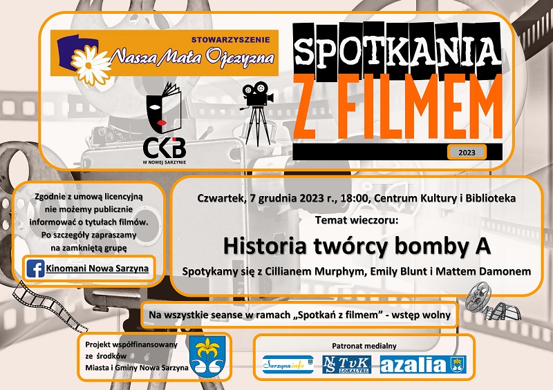 Aktualności Kino Komunikaty Kultura i rozrywka Społeczność lokalna Wydarzenia Ostatni tegoroczny seans w ramach „Spotkań z filmem”. Przez Redakcja Wysłany dnia 30 listopada 2023 1 min read 0 0 1,987 Podziel się Facebook Podziel się Twitter Ostatni tegoroczny seans w ramach „Spotkań z filmem”. W czwartek, 7 grudnia o 18:00 w nowosarzyńskim kinie odbędzie się ostatni tegoroczny seans w ramach projektu „Spotkania z filmem”. Organizatorzy przygotowali na ten wieczór filmową biografię jednego z twórców amerykańskiej bomby atomowej. Ponieważ wymogi licencyjne nie pozwalają nam na publiczne informowanie o tytułach filmów, po szczegóły zapraszamy na zamkniętą grupę „Kinomani Nowa Sarzyna” na facebooku. Po seansie przeprowadzony zostanie konkurs o tematyce filmowej. Projekt „Spotkania z filmem”, prowadzony przez Stowarzyszenie „Nasza Mała Ojczyzna” oraz Centrum Kultury i Bibliotekę, współfinansowany jest przez Miasto i Gminę Nowa Sarzyna. JW