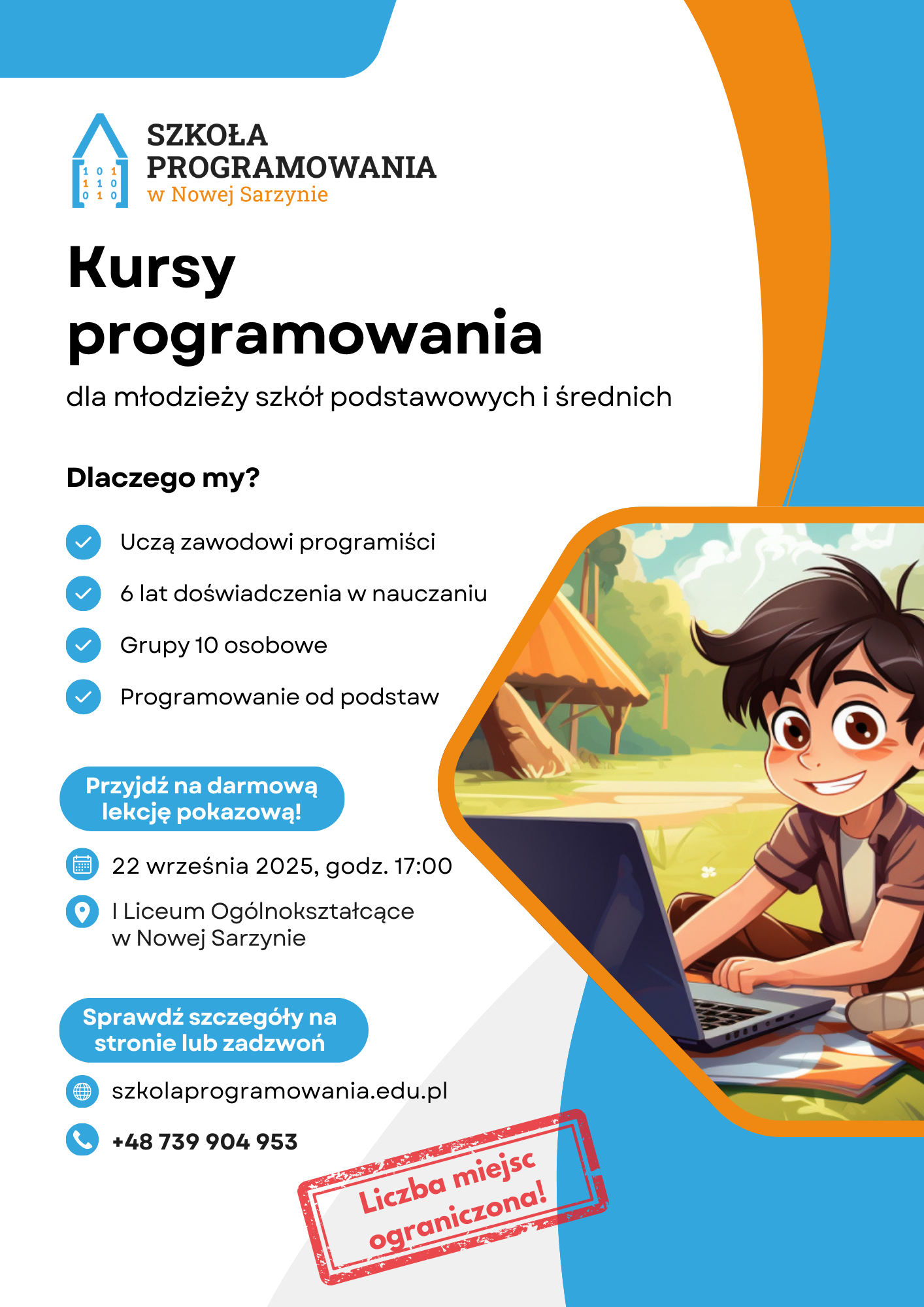 Aktualności Komunikaty Społeczność lokalna Wydarzenia Rusza nabór na nowy semestr Szkoły Programowania dla Dzieci i Młodzieży Przez Redakcja Wysłany dnia 28 sierpnia 2025 1 min read 0 0 787 Podziel się Facebook Podziel się Twitter 📢 RUSZA NABÓR NA NOWY SEMESTR SZKOŁY PROGRAMOWANIA DLA DZIECI I MŁODZIEŻY! 🚀 Twoje dziecko spędza dużo czasu przed ekranem? Pokaż mu, że komputer to nie tylko gry i YouTube!W naszej szkole nauczy się zamieniać czas online w naukę i twórcze projekty 🤓 Daj dziecku szansę na:🔵 poznanie możliwości, jakie daje programowanie🟠 lepszy start w przyszłość – szerszy wybór kariery zawodowej🔵 rozwijanie kreatywności i logicznego myślenia 📌 Organizacja zajęć:✅ 14 zajęć ✅ raz w tygodniu po 2 godziny✅ małe grupy (max. 10 osób) Pierwsze zajęcia są próbne – po nich dziecko samo zdecyduje, czy chce kontynuować! 📍 Lokalizacja: I LO, Nowa Sarzyna 📆 Zapisy trwają do 22 września 2025 roku. 👉 Zapisz dziecko już dziś:📞 739 904 953🌐 Formularz zgłoszeniowy 💪 Zadbaj o przyszłość swojego dziecka – niech nowy semestr będzie krokiem ku pasji i rozwojowi!