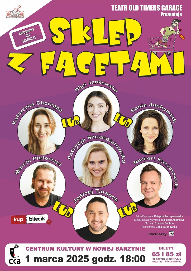 Aktualności Komunikaty Kultura i rozrywka Spektakl komediowy „Sklep z facetami” Przez Redakcja Wysłany dnia 22 stycznia 2025 1 min read 0 0 721 Podziel się Facebook Podziel się Twitter Informacja Centrum Kultury w Nowej Sarzynie: Drogie Panie!Z okazji zbliżającego się Dnia Kobiet serdecznie zapraszamy Was na wyjątkowy spektakl komediowy „Sklep z facetami”, który odbędzie się 1 marca o godzinie 18:00 w naszym Centrum Kultury.„Sklep z facetami” to pełna humoru opowieść o relacjach międzyludzkich, miłości, zaskakujących sytuacjach i przede wszystkim… facetach! To doskonała okazja, by spędzić wieczór w towarzystwie śmiechu, dobrej zabawy i scenek pełnych niespodzianek, które z pewnością wprowadzą Was w świetny nastrój.Pamiętajcie, że Dzień Kobiet to idealny moment na relaks i odrobinę śmiechu. Przyjdźcie z przyjaciółkami, koleżankami, mamą, albo po prostu dla siebie!P.S. zabierzcie ze sobą również swoich mężczyzn – oni również znajdą coś dla siebie Gdzie: Centrum Kultury w Nowej Sarzynie (ul. 1 Maja 1)Kiedy: marca, godzina 18:00Bilety: 85 zł/65 zł (do nabycia w kasie Centrum Kultury oraz na stronie bilety.ckib.eu)Zapraszamy serdecznie i czekamy na Was!