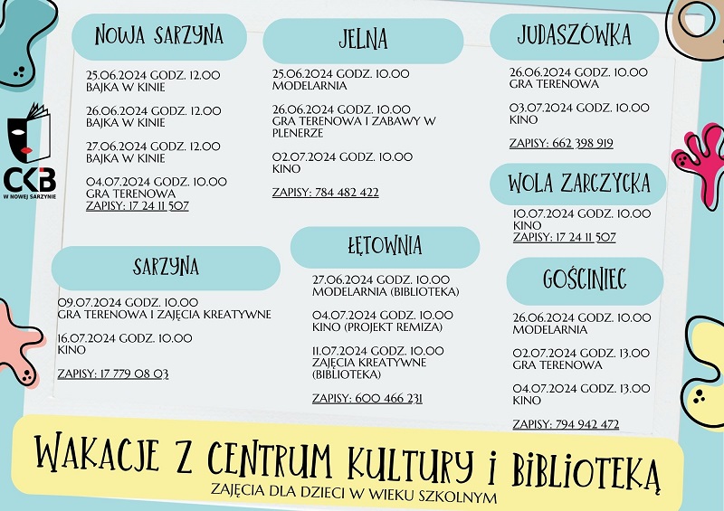 Aktualności Komunikaty Wydarzenia Wakacje z Centrum Kultury i Biblioteką! Przez Redakcja Wysłany dnia 19 czerwca 2024 13 po drugie przeczytaj 0 0 1,051 Podziel się Facebook Podziel się Twitter Centrum Kultury i Biblioteka w Nowej Sarzynie zaprasza dzieci w wieku szkolnym na zajęcia podczas wakacji. Obowiązują zapisy.